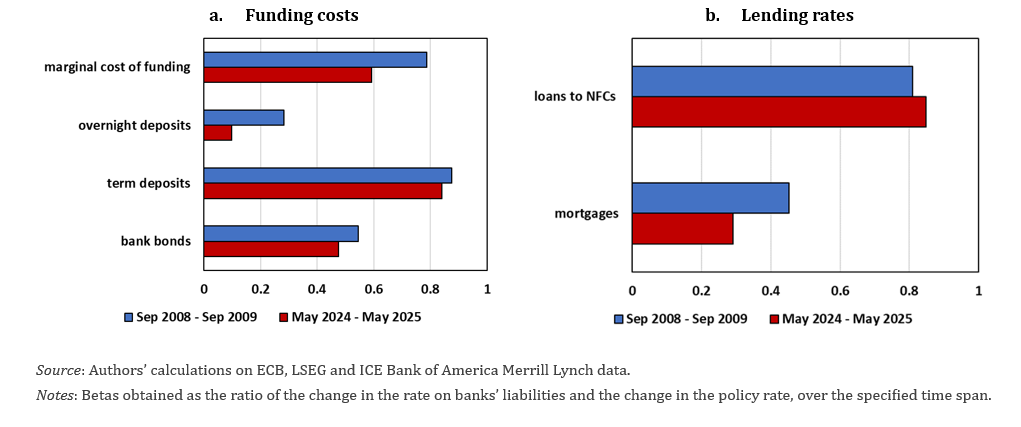 This policy brief assesses the transmission of the monetary policy easing that began in June 2024 to bank funding costs and lending rates in the euro area up to May 2025. The pass-through to funding costs was weaker compared with the 2008–09 easing cycle, largely due to a muted response of overnight deposit rates. In contrast, lending rates to firms declined more markedly, reflecting banks’ subdued risk perception. A Vector Error Correction Model suggests that a sharp increase in risk perception can weaken the transmission of a monetary policy easing. However, during the 2024–25 cycle, risk perception remained contained, supporting an effective pass-through from reference rates to lending rates.