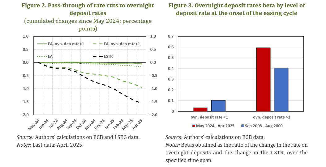 The weak pass-through to overnight deposit rates largely reflects their already very low level at the onset of the 2024 easing cycle, itself a result of the limited transmission during the 2022–23 tightening phase. This aggregate sluggishness is almost entirely driven by banks that, as of May 2024, remunerated overnight deposits at rates below 1 per cent (Figure 2). These institutions, which accounted for roughly 92 per cent of total overnight deposits, exhibited a beta close to zero. In contrast, banks offering rates above 1 per cent showed a significantly stronger pass-through.