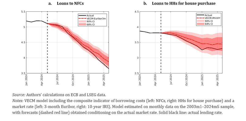 Since the start of the easing cycle, the actual NFC lending rate (Figure 4a, solid black line) closely tracked the model conditional forecast (dashed red line). It remained within the 68 per cent confidence bands through February 2025 and within the 90 per cent confidence interval thereafter. This suggests that the pass-through to NFC lending rates is broadly in line with historical regularities. The same holds for lending rates on households’ mortgages (Figure 4b). The actual path did not significantly deviate from the conditional forecast throughout the period, indicating a pass-throughbroadly consistent with historical averages also in this case.