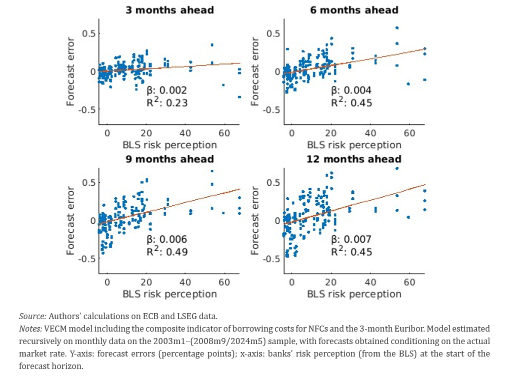 We also study how banks’ risk perception interacts with the pass-through of monetary policy to NFC lending rates. Figure 5 shows that the pseudo-out-of-sample forecast errors from the VECM tend to increase with banks’ risk perception, particularly at longer horizons.4 This suggests that the model performs well when banks’ risk perception is subdued but may underestimate lending rates during periods of heightened stress. In the 2024-25 easing cycle, risk perception and credit risk remained relatively contained. As a result, lending rate dynamics are well captured by the model, reinforcing the view of a broadly regular pass-through.