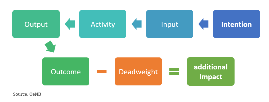 This framework outlines a step-by-step process for assessing an intervention’s (marginal or net) impact (Simsa, 2014). First, identify the original intention (goals). Next, determine the concrete inputs – financial and non-financial resources – that enable activities. These activities result in outputs, such as services or products, which produce outcomes or broader effects on people or society. However, to determine the impact, one must subtract the deadweight, or outcomes that would have occurred anyway (Carr et al., 2008). The remaining impact is “what makes the difference.” While outcomes often appear at the societal level, more tangible outputs can also indicate meaningful impact, especially when broader outcomes are difficult to measure (Brest and Born, 2013).