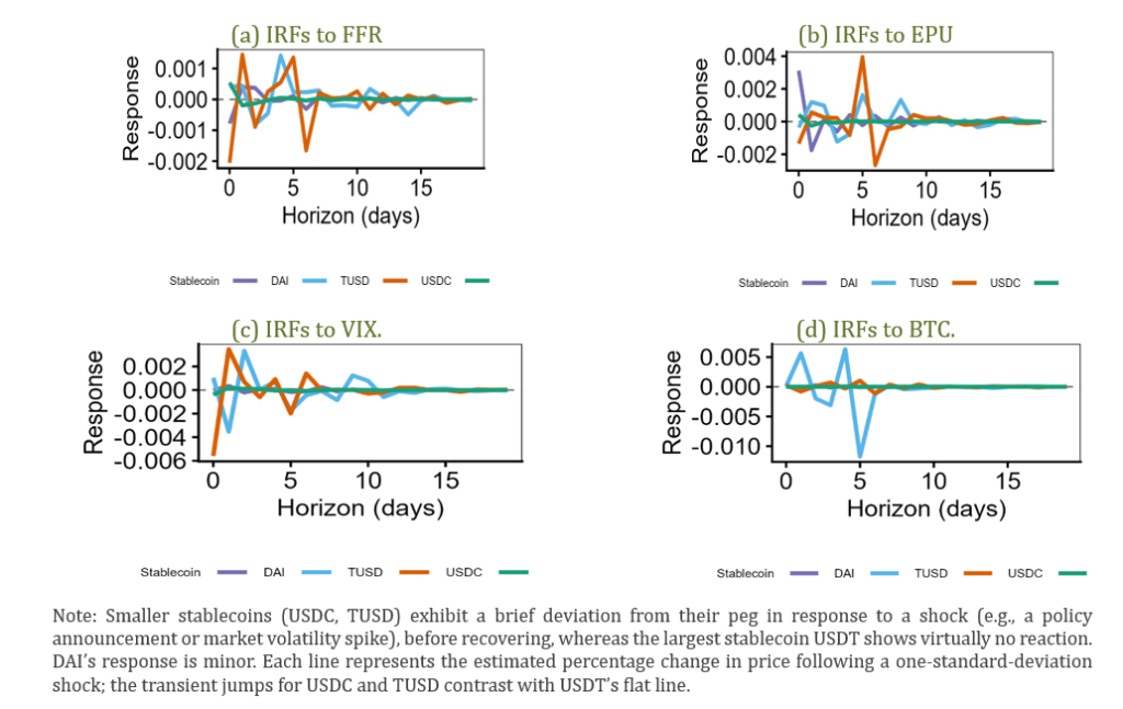 One way to test a stablecoin’s robustness is to see how it reacts to sudden economic or financial shocks. In the study, we simulate the impact of various shocks, including a spike in market volatility, a jump in economic policy uncertainty, a sudden interest rate hike, and a broad cryptocurrency market drop on each stablecoin’s price. The results reveal a clear heterogeneity in stablecoin responses. Two of the stablecoins, USDC and TUSD, exhibit noticeable but short-lived price movements following such shocks, whereas USDT remains essentially unfazed and DAI shows only modest, brief changes. In other words, a surprise event that causes turbulence in markets might make USDC or TUSD deviate slightly from their $1 peg for a short time, while USDT’s price stays virtually flat.