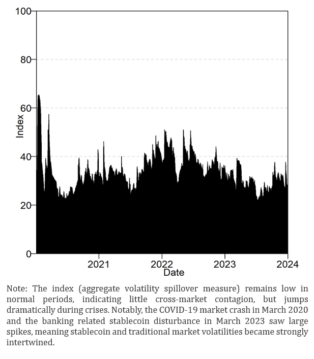 Beyond individual price stability, a key concern for regulators is whether stablecoins could serve as channels for financial contagion. Do stablecoins merely react to crises, or can they amplify and transmit stress across the financial system? To answer this, the research examined how intertwined stablecoins are with traditional financial markets over time, essentially mapping their “connectedness” with other assets and risk indicators. The analysis tracked a metric called the total connectedness index, which rises when volatility shocks are spreading widely between stablecoins, cryptocurrencies, and conventional markets (like stocks or interest rates), and falls when markets are compartmentalized.