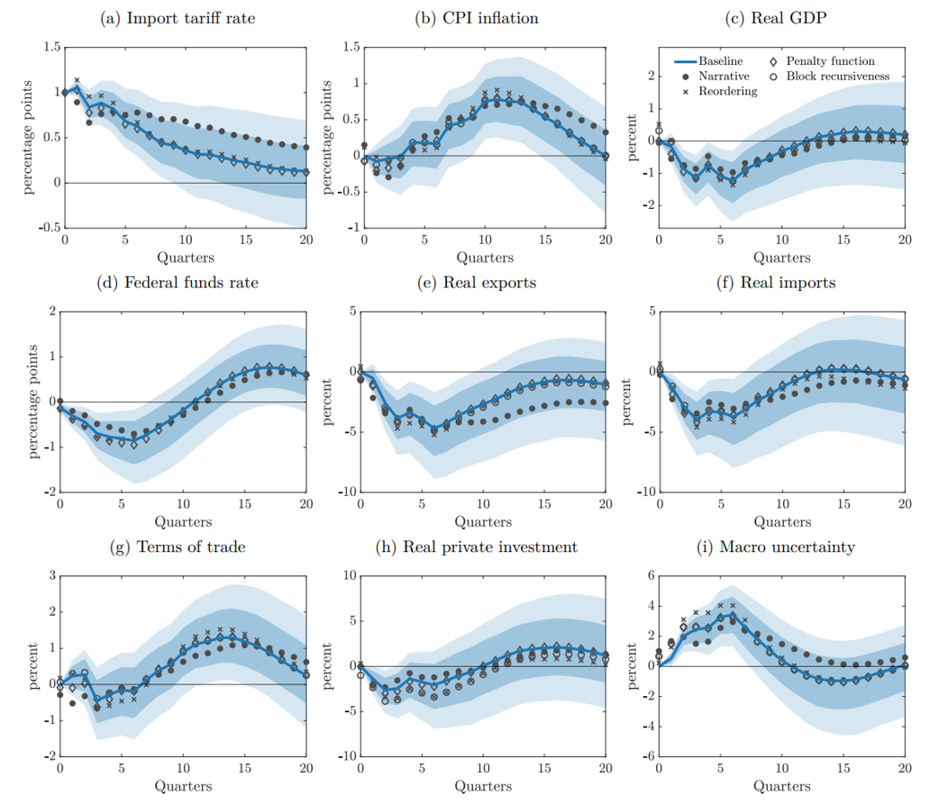 Note: This figure shows the macroeconomic responses to the import tariff shock. The solid blue line represents the posterior median, and the shaded areas are 68% and 90% credible sets. The baseline estimates impose the identifying restriction that the shock affects only the import tariff rate and the federal funds rate contemporaneously. The gray markers show the posterior medians using alternative identification approaches that relax the baseline assumptions. Reordering: We relax each zero restriction individually by reordering the VAR vector. Block recursiveness: we jointly relax the zero restrictions for all “fast moving” variables, which are macro uncertainty, terms of trade, and CPI inflation. Penalty function: we identify the tariff shock by maximizing the impact on the tariff rate for the first four quarters after the shock. Narrative: We compile a time series that captures changes in tariffs due to narratively identified tariff policy changes, include this series as an additional exogenous variable to the VAR, and present responses to a shock to this series.