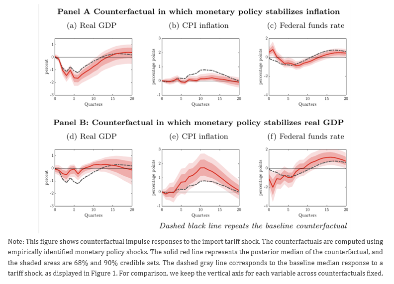 To answer these questions, in Franconi and Hack (2026), we use vector-autoregression models and U.S. time series data between 1990 and 2024. We establish that tariff shocks are both contractionary and inflationary, confirming that tariffs act as adverse supply shocks that imply a meaningful monetary policy tradeoff. To quantify this tradeoff, we construct monetary policy counterfactuals without relying on a microfounded structural model. Instead, we follow McKay and Wolf (2023) and use empirically identified monetary policy shocks to build counterfactuals that are robust to model misspecification and the Lucas critique.