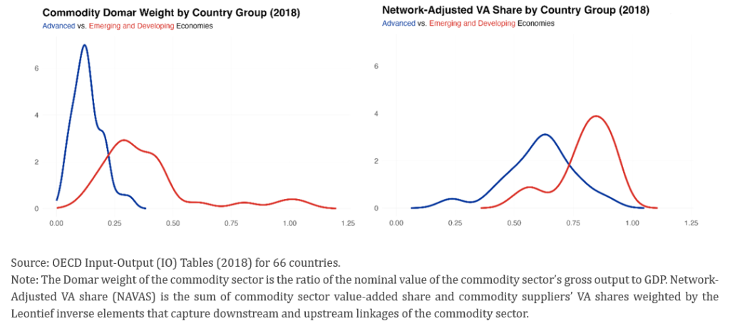 To measure the commodity sector’s interconnectedness, we rely on the network-adjusted value-added share (NAVAS) of the commodity sector (Silva and others, 2024; Qiu and others, 2025), or the share of the commodity sector’s value added allocated to its factors of production – directly and indirectly –when considering all interlinkages, upstream and downstream.