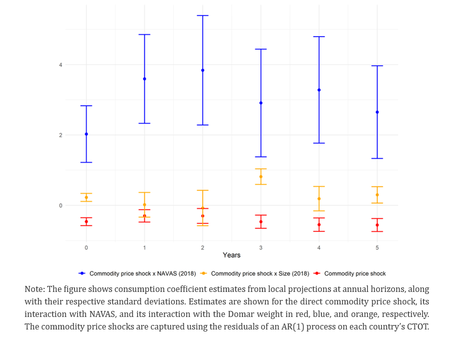 Following a positive CTOT shock, countries with higher NAVAS experience stronger positive consumption responses (Figure 3). The amplification effect of NAVAS for TOT shocks is statistically significant and robust across horizons (blue line) while the effect of sector size on the transmission of TOT shocks is modest and often insignificant (orange line).
