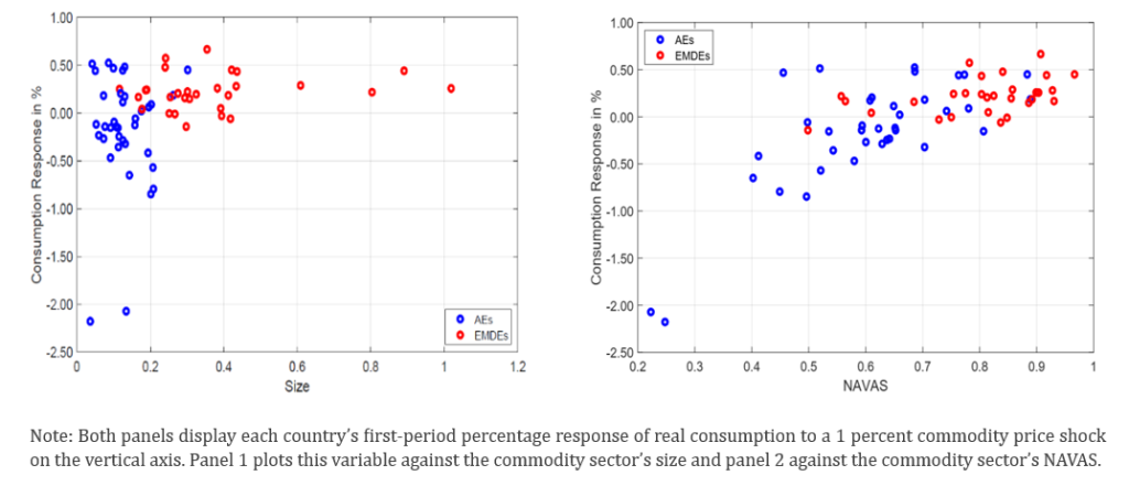 Another, more direct, way to look at the relationship between NAVAS and consumption is to show the relationship between the NAVAS (horizontal axis) and the correlation between countries’ cyclical consumption and commodities’ terms of trade (CTOT) (Figure 2, panel 2). The relationship is clearly positive, meaning that countries with a more interconnected commodity sector (higher NAVAS) tend to display stronger correlation between aggregate consumption and commodities terms of trade. While most EMDEs (in red) tend to be on the upper-right corner, suggesting higher correlation of consumption with CTOT and higher NAVAS than in AEs (in blue), some AEs (for example, Norway, Australia, New Zealand, Canada) have larger NAVAS and co-movements than many EMDEs (for example, Bulgaria, Hungary, Poland, South Africa), again consistent with Figure 1, panel 2.