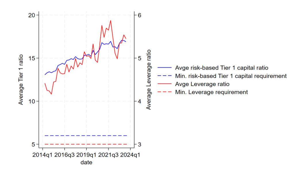 In addition to the ratios considered in our study, the Basel III agreement has also introduced an “output floor”, which limits relative capital gains of banks using the internal model approach for the computation of their risk weighted assets. The implementation of this measure started in Europe in 2025. It could potentially interact with the leverage ratio since it consists in increasing the capital requirements of certain banks by limiting the effect of risk weighting.