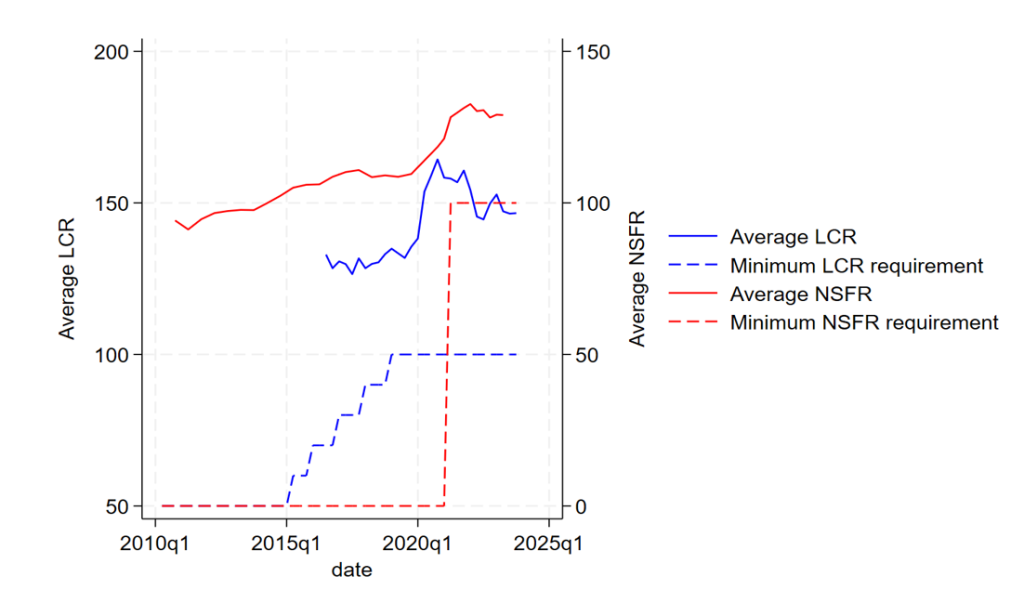 Empirical papers using Quantitative Impact Studies data provide mixed results. The results found by the BCBS Task Force on Evaluation (BCBS (2022)) from the analysis of the impact of Basel III reforms on banks’ capital and liquidity revealed few significant effects of their interactions on banks’ lending growth. Using proxy data, Buckmann et al. (2023) found that different requirements act in complementary ways to capture different sources of risk (namely riskiness, leverage and liquidity) and that a combination of a leverage ratio, a risk-weighted capital ratio and the NSFR correctly identifies a high proportion of failed banks during the global financial crisis or the European sovereign debt crisis. Finally, a more recent paper (Haq et al., 2025) emphasized a conflicting effect between capital an liquidity ratios as the authors find that higher capital increases idiosyncratic liquidity risk by decreasing cash and near-cash assets, raising fed funds sold, and reducing fed funds purchased, during crisis periods for US banks.