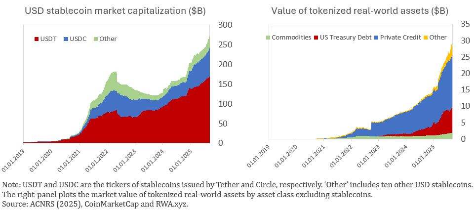 Figure 2. Market capitalizations of USD-pegged stablecoins (left) and tokenized RWAs (right)