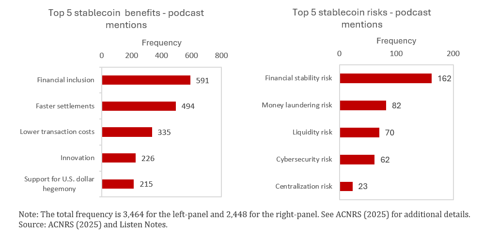 Figure 1. Frequencies of podcast speaker mentions of stablecoin benefits (left) and risks (right)