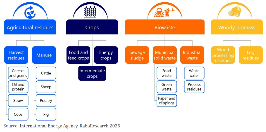 Biogases are produced from a variety of organic feedstocks, which can be categorized as shown in figure 2. One of the main advantages of biogas production is that it allows for the processing of several residues and waste streams, therefore directly contributing to circularity.3 Due to current European regulations – mainly under the Renewable Energy Directive (RED III) – residue and waste streams are prioritized over food and feed crops. The goal is to prevent biogas production from (directly) interfering with food and feed production.