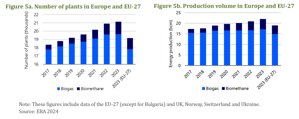 Combined biogas and biomethane production in Europe grew by 5% in 2023, reaching 22bcm, or 234 terawatt hours (TWh) – about 7% of the EU’s natural gas consumption. The EU-27 (excluding Bulgaria) contributed 18.9bcm, produced in 19,160 plants (see figure 5b).