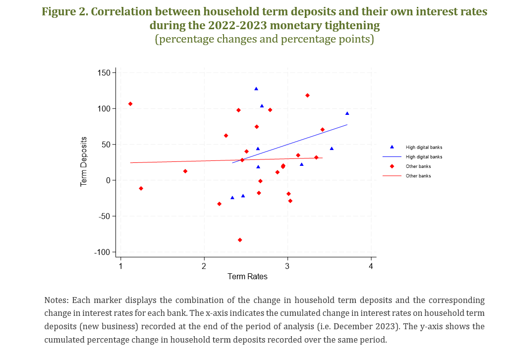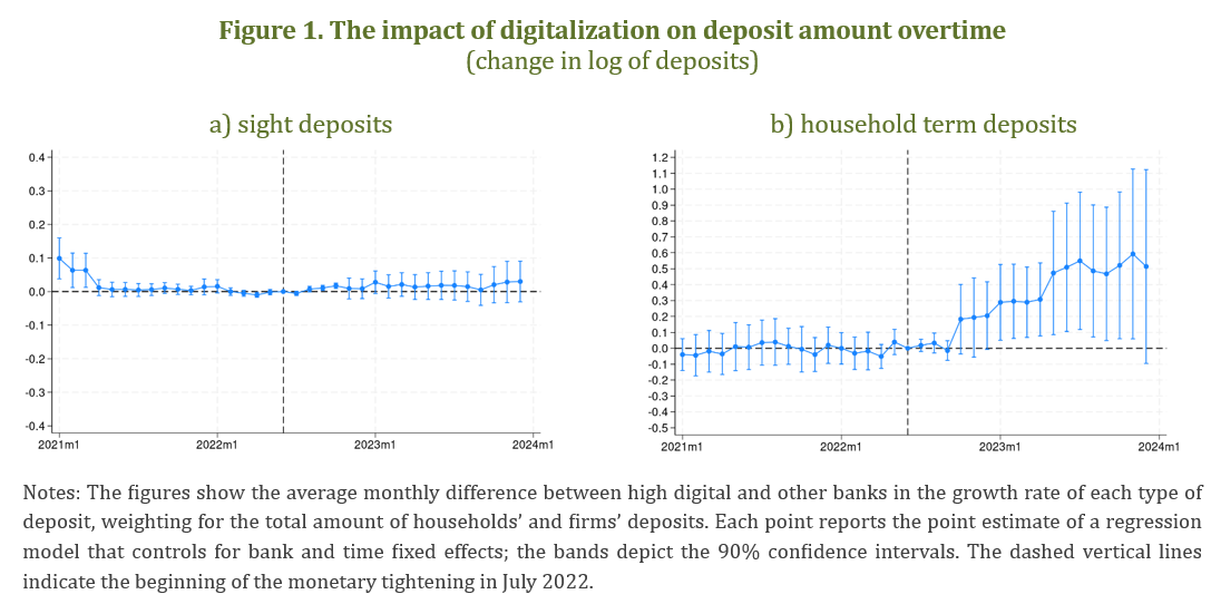 This policy brief analyzes whether the deposits of “high digital” banks, i.e. those whose customers mainly use online money transfers, are more sensitive to changes in interest rates following the monetary tightening in 2022. We show that there are no significant differences between high digital and other banks in the decline of sight deposits and in the dynamics of the associated interest rates. By contrast, household term deposits and the related interest rates increase more for high digital intermediaries compared to other banks. This larger increase in household term deposits is not correlated with the main indicators of bank vulnerabilities, while it is driven by ex-ante larger and more profitable high digital banks and by those with a lower initial share of household term deposits. Overall, the stronger sensitivity of deposits of high digital banks seems to be limited to household term deposits with no negative impact on their profitability.