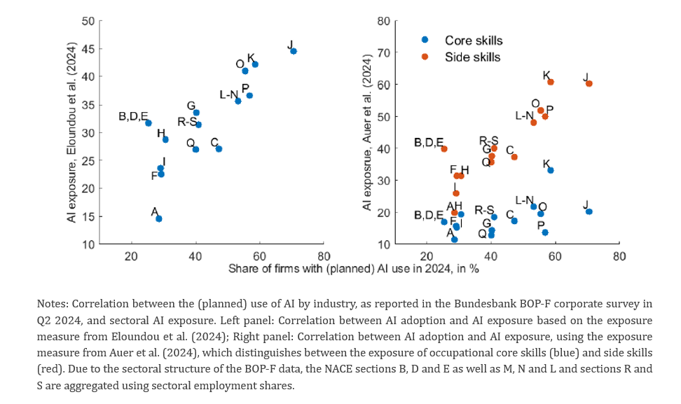 This observation is in line with the assessment that the technology currently tends to support employees rather than fully replacing them at the occupational level (see, e.g., Gmyrek et al., 2023; Bonney et al., 2024). It also fits with the fact that the intensity of AI usage among firms is still low in Germany. According to the BOP-F survey results, only 3% of German firms used AI comprehensively in 2024 (Deutsche Bundesbank, 2024). Most firms reported only limited or experimental usage. It is important to keep in mind, however, that this is merely a snapshot in time, which depends, inter alia, crucially on the capabilities of AI. As outlined in Auer et al. (2024), the AI exposure of occupational core skills can increase significantly with the progress of AI capabilities.