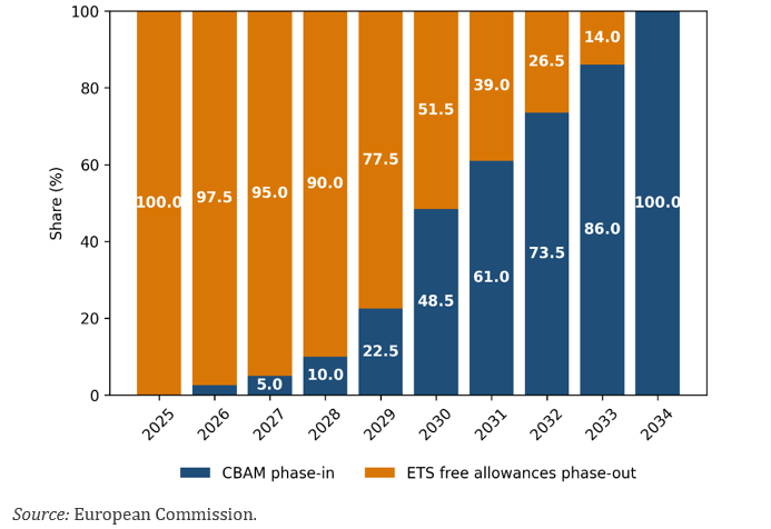 Figure 1. Timeline for CBAM phase-in and ETS free allowances phase-out (Percent)