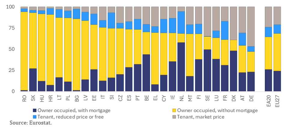 Housing markets across the EU exhibit wide structural diversity in ownership patterns, financing models, and tenure forms. Home-ownership rates range from around 50 % in Germany to 90 % in Romania and Slovakia (Graph 1), reflecting historical legacies such as post-transition privatisation, as well as legal frameworks, fiscal incentives, and cultural preferences. Since 2015, homeownership has fallen by about 2 pps. EU-wide, with sharper declines among young adults, who increasingly remain in the parental home or turn to renting due to affordability and labour-market constraints. Mortgage incidence varies widely: while most owners in western and northern Europe finance their homes through mortgages, homeownership in Central and Eastern Europe resulted from post-socialist privatisation rather than credit expansion. At the same time, the share of tenants in the EU has risen to about one-third of the population and there are pronounced differences between the market-price and reduced-price rental segments. In several countries, social housing shortages have led to long waiting lists and stimulated alternative tenure models such as cooperatives, cohousing, and shared housing, which enhance affordability and community engagement but face regulatory and financing barriers.