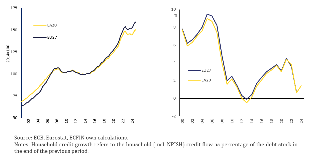 Graph 2. Nominal house prices (lhs), and household credit growth (rhs) in the EU and EA, 2000‑2024