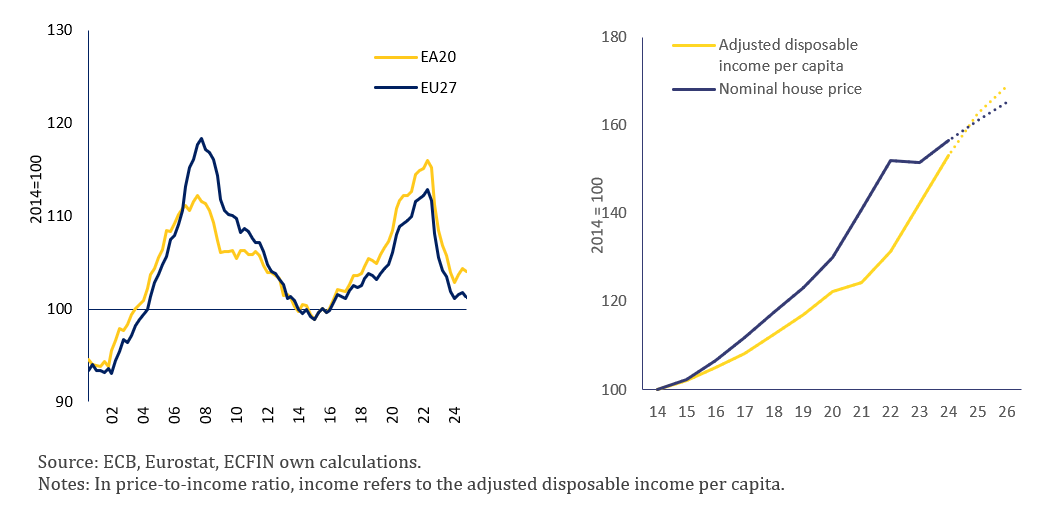 Graph 3. Price-to-income ratio (lhs) EU and EA, 2000-2024, and EU nominal house price and income growth (rhs), 2013-2026
