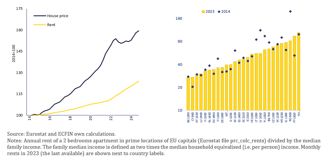 In many EU countries, rental markets remain underdeveloped and do not provide a viable alternative to homeownership. Over the past decade, rents for existing contracts in the EU have risen much more slowly than house prices, making renting appear relatively more affordable when measured by standard indices (Graph 5, left panel). However, these indices largely reflect only existing contracts and often exclude new leases, which have surged in many locations. Indexation rules limit increases on existing rents, while higher house prices for buy-to-let investors drive up rents on new contracts. This creates distributional pressures, particularly for younger adults entering the rental market. In major cities, new rental costs remain exceptionally high, often exceeding 50% of the income of a two-person household, highlighting persistent affordability challenges despite the slower growth of standard rents (Graph 5, right panel).
