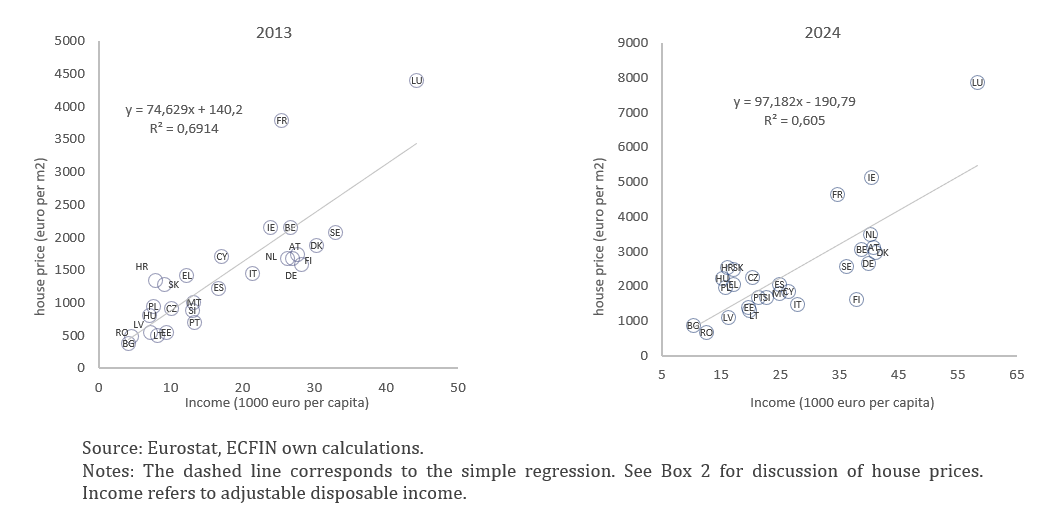 Household incomes are the key determinant of housing demand, closely correlating with house prices across EU countries. The empirical evidence indicates that housing demand has a high income-elasticity. This means that as incomes increase, so does the demand for housing.8 Graph 7 shows the close correlation between the average income per capita (in euro) and nominal house prices per square metre, in 2013 and 2024. However, despite this overall pattern, the house price level in some countries – such as in Finland or Italy in 2023 – is relatively low considering the average income or relatively high – in Ireland and Luxembourg for instance.
