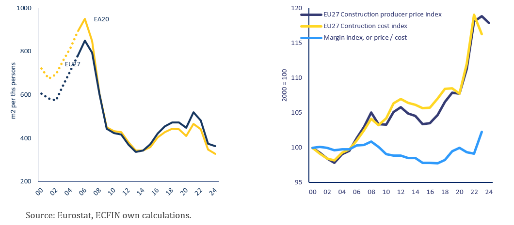 Recent trends in building permits and sharply rising construction costs highlight mounting pressures on new housing supply across the EU.25 While there was some upward trend in permits until 2021, they have declined to historical lows since 2022 (Graph 10, left panel). While the numbers may not be fully comparable between countries, the historical comparison shows that building permits are close to historical lows in most EU countries. For nearly two decades (2000–2020), construction prices remained relatively stable in real terms. However, costs increased strongly over the pandemic and even more so in the years since, with construction costs rising faster than the already high inflation (Graph 10, right panel). Between 2020 and 2022, the cost of labour and prices of materials surged significantly, exacerbated by supply chain disruptions and soaring commodity prices, including energy. In 2022, higher interest rates became another factor putting upward pressure on construction costs.