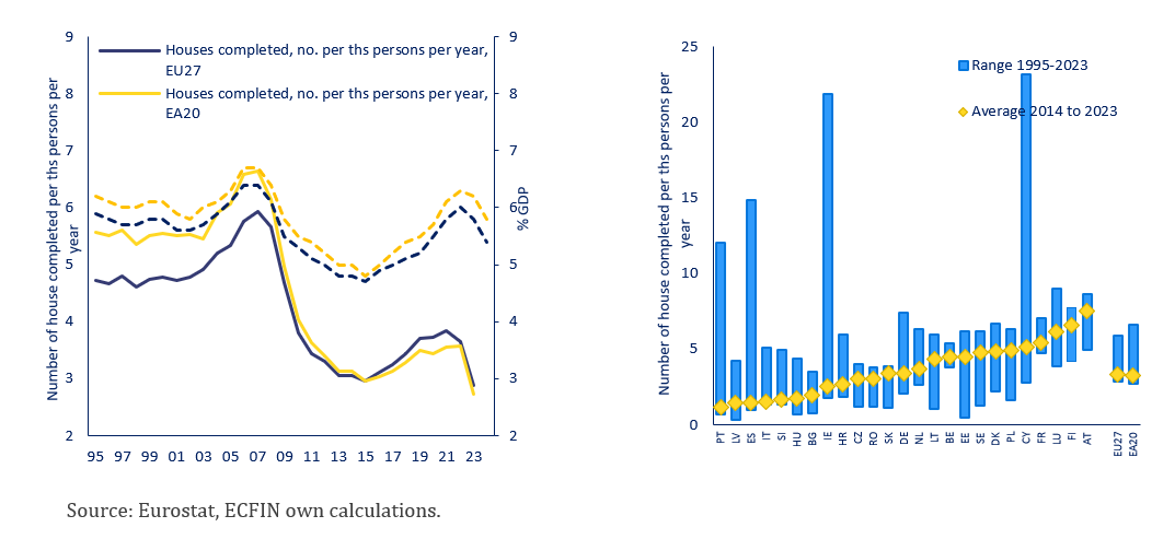 Rising house prices over the past decade reflect constrained supply and regulatory barriers limiting new housing delivery. Over the last decade, the supply of new homes has failed to keep pace with demand, with construction activity remaining at historically low levels. As a result, rising demand linked to income growth has primarily translated into higher prices rather than increased supply. Supply constraints are often reinforced by complex regulatory environments. While some regulations stem from EU legislation, many are set at the national or local level, and additional layers introduced by Member States or municipalities can hinder overall housing delivery and affordability.