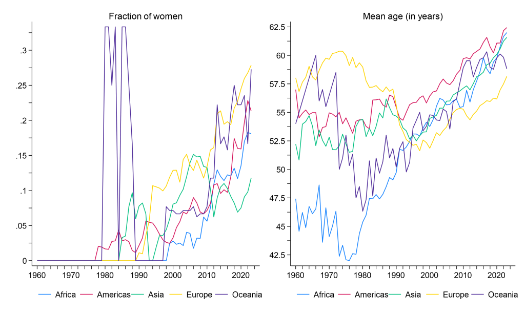 Figure 1. Fraction of women and mean age of central bank leaders over time