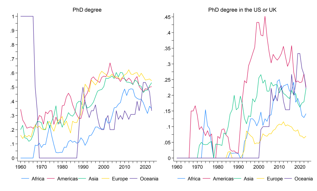 Education and studies abroad increased significantly across all continents. Figure 2 shows that the fraction of PhDs in central bank leadership increased from around 20% in the early 1970s to 40% or more in recent years. There is also an increasing share of central bankers with studies abroad in the US or UK (a measure that excludes nationals of those countries). In the early 1960s, few central bankers had studies abroad in the US or UK. But this fraction increased in the 1970s, especially in the Americas, Africa and Asia. The early 2000s saw a peak of US-UK PhDs in the Americas and Asia, which reached fractions of 45% and 25% respectively. In Oceania the share of US-UK PhDs kept increasing and peaked around 35% shortly before the pandemic. The share of US-UK PhDs in Europe is much lower, fluctuating around 10% since the early 2000s.