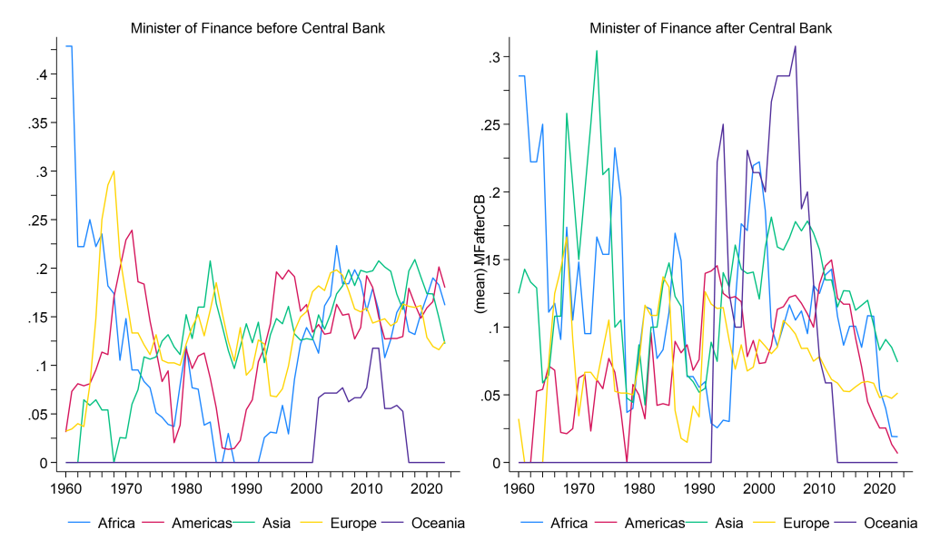 Figure 3. Fraction of central bank leaders with ministry of finance roles before or after their central bank mandates