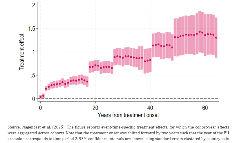 The dynamics of EU trade effects reveal sustained growth that distinguishes the Single Market from typical trade agreements. We find small anticipation effects two years before formal accession, potentially related to the signing of accession treaties and economic actors’ forward-looking behavior. Upon accession, trade effects increase rapidly and continue growing over decades, which contrasts sharply with most free trade agreements where benefits plateau after 10-15 years (Figure 2). This long-term dividend likely reflects the EU’s evolving nature, with continuous deepening through initiatives like the Single European Act, the eurozone, and ongoing regulatory harmonization.