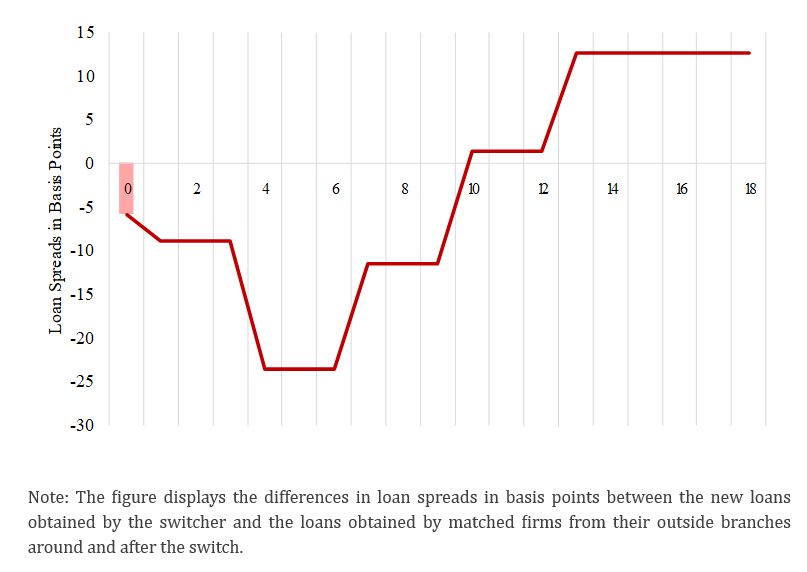 These initial pricing benefits do not remain static, as shown in Figure 1. The spread discount deepens by an additional 18 basis points over the first two quarters following the switch, indicating that outside branches engage in particularly aggressive pricing during the early phase of the new relationship. Such introductory discounts are consistent with branch-level incentives to expand client portfolios and demonstrate competitive behavior even within the boundaries of a single banking institution. Yet these advantages gradually dissipate. Within about a year, switching firms’ loan spreads converge back to the average borrowing cost, and eventually even rise above it. This rise-and-revert cycle indicates that once the outside branch develops sufficient borrower-specific knowledge, it leverages this informational advantage to extract rents, effectively becoming a new incumbent. Such dynamics imply that soft information does not flow seamlessly across branches. Instead, intra-bank organizational frictions meaningfully constrain information transmission, causing each branch to rebuild its own information set and adjust prices accordingly. These dynamics reinforce the broader conclusion that, even within a single bank, loan pricing is shaped by localized incentives, limited internal coordination, and incomplete sharing of relationship-specific information, leading to intra-bank hold-up.