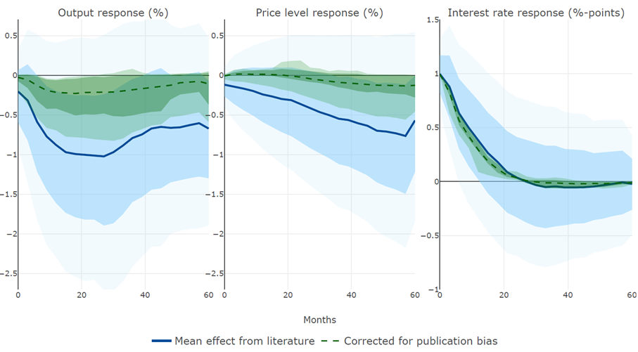 Source: Enzinger et al. (2025). The figures show average responses for output and the price level (in percent), and the percentage point response for the interest rate (blue lines) after a contractionary 100bp shock to the monetary policy rate, along with the blue-shaded average upper and lower 68% and 95% confidence intervals. Additionally, the figures contain a range of publication bias-corrected output, price level and interest rate responses (green area). This range displays the 16th-84th and the 2.5th-97.5th percentile range of bias corrections from up to 42 meta-regression estimates for each response horizon, based on a combination of (i) seven variants of established methods to detect and correct for publication bias and (ii) six levels of winsorization of outliers. The mean of this range is shown as the dark green dashed line.