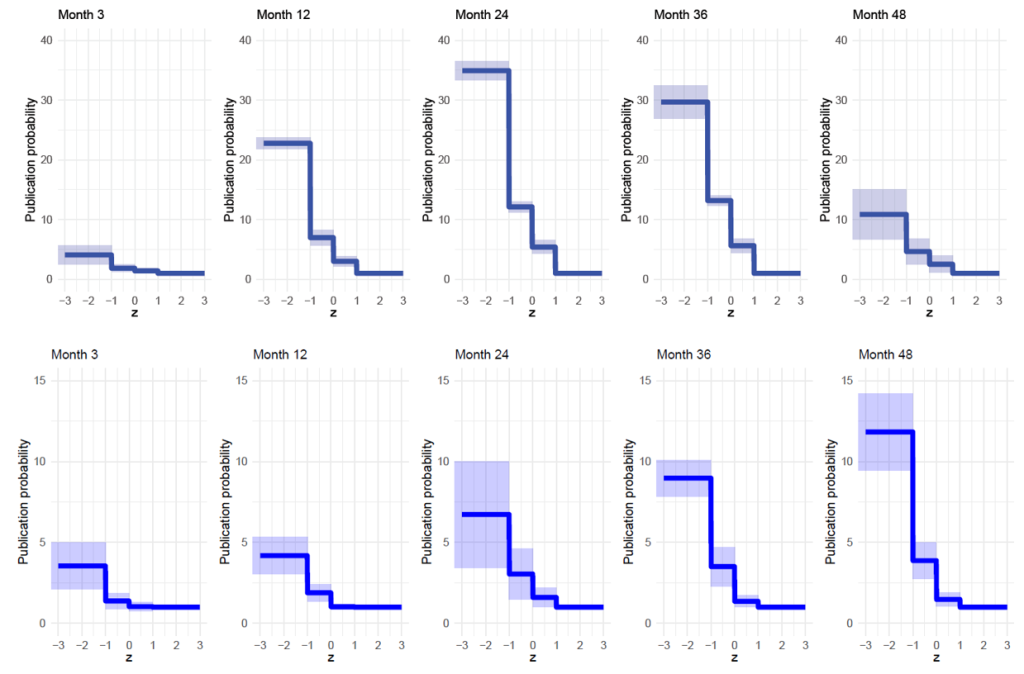 Source: Enzinger et al. (2025). The figures show relative conditional publication probabilities of output and price level responses on the vertical axis for typical ranges of statistical significance (horizontal axis) at different time horizons. Shaded areas show 89% confidence bands. The method is explained here.