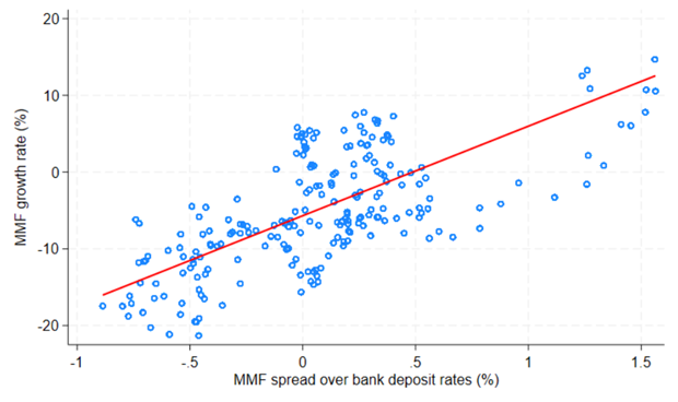 Notes: The chart plots the relationship between MMF growth and the yield spread between MMFs and bank deposits (MMF spread). Each point represents the monthly average across MMF funds and domiciles from January 2005 to January 2024. The upward slope indicates that higher relative MMF yields are associated with faster MMF growth. Results are consistent with panel regression estimates controlling for macroeconomic, financial and fund variables. Variables are standardized to have a mean of zero and a standard deviation of one. Sources: Lipper and author’s calculations.