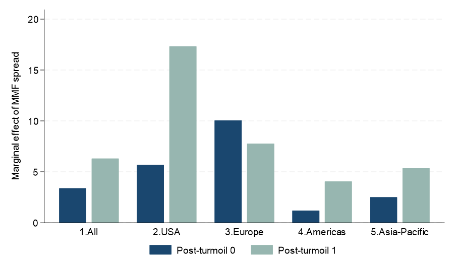 Notes: The Figure reports estimates for all countries and by region of the interaction term between MMF Spreads and a dummy variable, which equals 1 from March to June 2023 and 0 in the previous hiking cycles. The Americas region includes Brazil, Chile, and Mexico (excluding the U.S.), Europe includes France, Ireland and Luxembourg, and the Asia-Pacific region includes Australia and Korea. Controls include country-specific inflation and GDP, the VIX (common across countries) as a proxy for global risk aversion, and the yield curve spread (10-year minus 2-year). The specifications also control for individual jurisdictions and MMF size (not reported). All continuous variables are standardized to have a mean of zero and a standard deviation of one. Sources: Lipper, Bloomberg and author’s calculations.