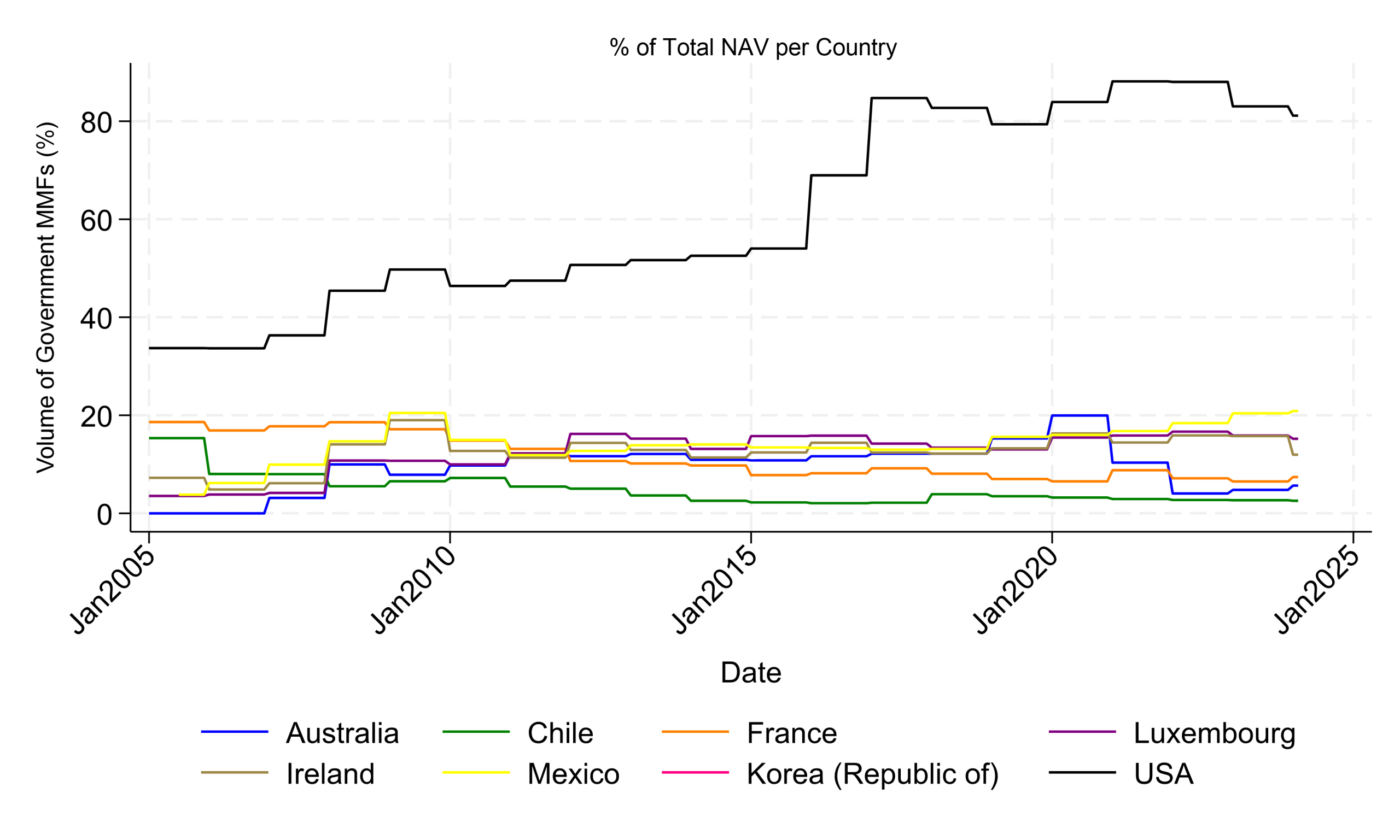 In contrast, outside the United States, public-debt MMFs are far less prevalent. Their relative size has remained broadly stable or even declined across most other countries in the sample. Public-debt funds hold a notable share only in Korea, where they account for around 40% of the MMF sector, while in other jurisdictions their share is below 20%. In Europe, funds with characteristics equivalent to U.S. government MMFs—namely constant net asset value (CNAV) funds—represent only about 10% of total EU MMF assets.