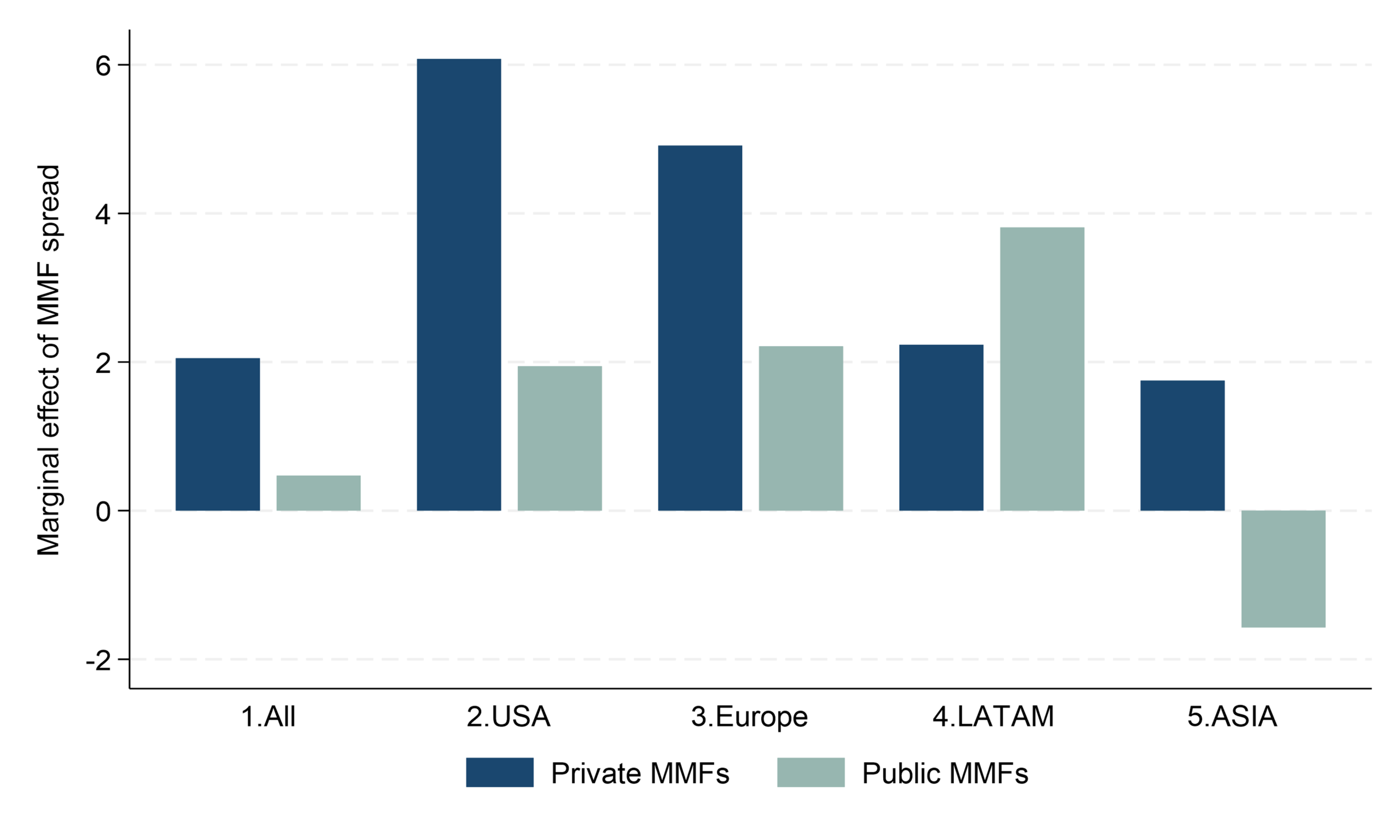 Globally, a more consistent pattern is that public-debt MMFs tend to grow less than private-debt ones during periods of widening MMF spreads, suggesting that investors seeking higher yields shift toward private funds (Figure 6). Further results suggest that this yield-driven reallocation is particularly evident after the 2023 banking turmoil, consistent with earlier findings that investor sensitivity to MMF spreads increased.