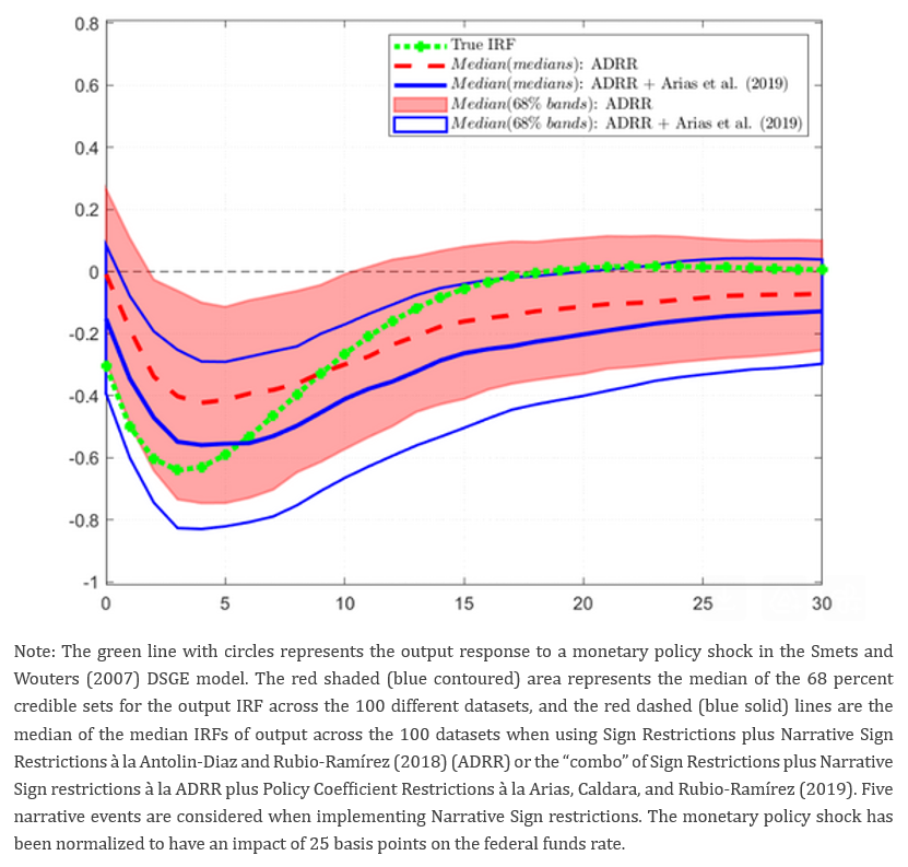 Using Uhlig’s (2005) original U.S. dataset, we replicate the exercise with actual data. Antolín-Díaz and Rubio-Ramírez’s narrative restrictions already improve the output response relative to Uhlig’s. Yet adding policy-coefficient restrictions further sharpens the short-run contractionary effect, as shown in Figure 2.