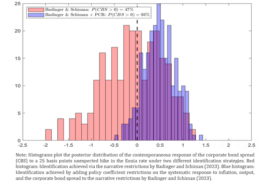To assess whether our findings are U.S.-specific, we repeat the analysis with Euro area data, focusing on the corporate bond spread (CBS). Badinger and Schiman (2023), using narrative restrictions only, find an unexpected easing of credit conditions following a contractionary policy shock. Examining the implied systematic policy rule reveals why: the estimated ECB response includes the counterintuitive feature of raising the policy rate when credit conditions tighten. Imposing the correct sign on this policy coefficient overturns this artefact. As shown by Figure 5, with the combo in place, the distribution of CBS responses shifts toward the expected tightening following a monetary contraction.