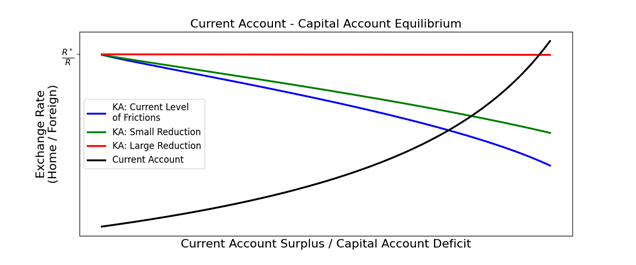 Source: Reuter et al. (2025). This figure shows the current account and capital account balances as a function of the exchange rate, with an initial level of frictions and after frictions are reduced.