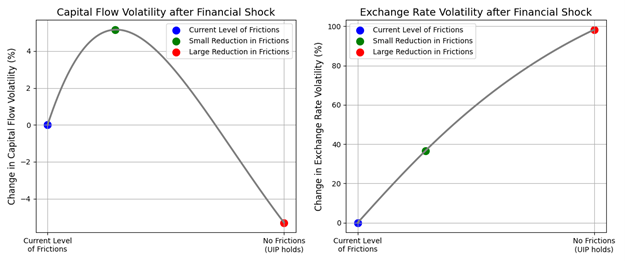 Source: Reuter et al (2025). This figure shows how capital flow and exchange rate volatility following a financial shock change as the level of frictions is reduced from a benchmark level. Given the stylized nature of our model, the values on the vertical axes should be considered illustrative rather than quantitative.