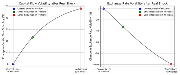 Source: Reuter et al (2025). This figure shows how capital flow and exchange rate volatility following a real shock change as the level of frictions is reduced from a benchmark level. Given the stylized nature of our model, the values on the vertical axes should be considered illustrative rather than quantitative.