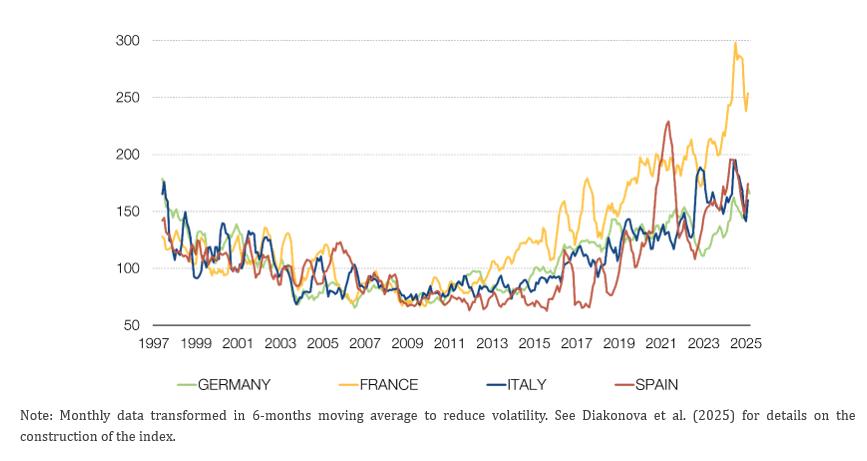 This policy brief is based on “Political polarization in Europe”, Banco de España Working Paper No. 2533, September 2025, by Marina Diakonova, Corinna Ghirelli, and Javier J. Pérez. All data and quotations are drawn from that study. The views expressed here are those of the authors of the original paper and do not necessarily represent the Banco de España or SUERF.