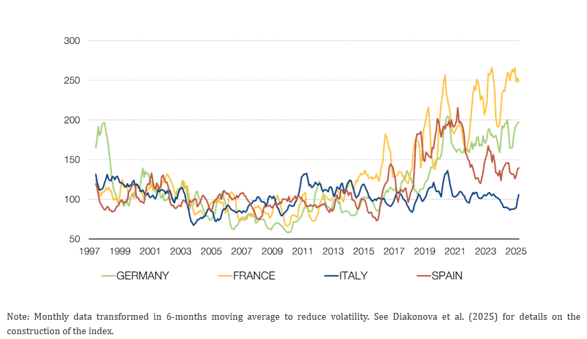 This study applies a straightforward, text-based approach to monitor changes in political polarization and legislative gridlock on a monthly basis, providing policymakers and analysts with up-to-date indicators of partisan conflict and policy stalemate. Using the Dow Jones Factiva archive, the analysis examines articles from major national newspapers in France, Germany, Spain, and Italy—including Le Monde, Le Figaro, Süddeutsche Zeitung, Die Welt, El País, El Mundo, Corriere della Sera, and La Repubblica. By processing a large number of news reports, the researchers generate two country-specific time series: one that measures references to partisan division and another that captures mentions of legislative deadlock.