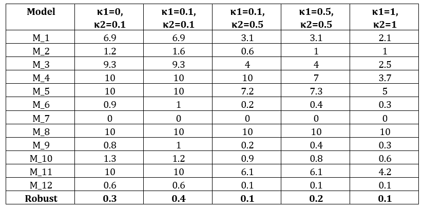 Note: The table reports the optimized model-specific φccyb coefficients for models M_1–M_12, and the model-robust coefficients in the last row, for different loss functions of the macroprudential authority. All loss functions stabilize the volatility of credit-to-output with a unit weight. κ1 refers to the weight attached to stabilizing output volatility and κ2 the weight attached to stabilizing volatility of the policy instrument.
