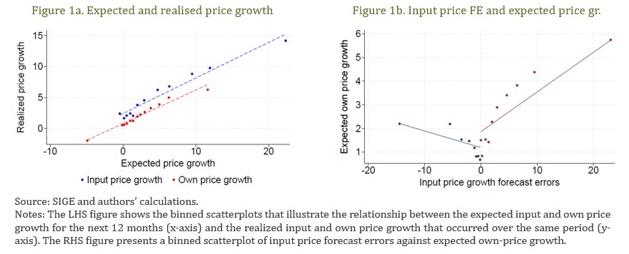 Figure 1a shows the relationship between expected and realised input and output price growth. The strong positive correlation confirms that firms track the evolution of their own input and selling prices remarkably well, supporting the reliability of the survey and the elicited expectations.