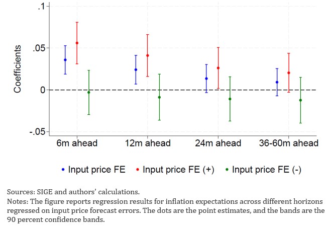 We quantify the impact of unexpected input cost changes by estimating regressions of firms’ expectations and pricing decisions on their input price forecast errors, and a set of controls like the sector in the firm operates and its size.