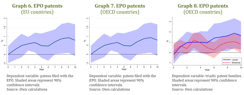Patents. Concerning patents filed with the EPO, we observe a gradual increase following the shock, in both samples (see Graphs 6 and 7). This increase becomes statistically significant after three years, reaching a growth of over 0.5%, and approaching 1% after ten years. This six-year lag would be expected if defence R&D first generated patentable knowledge, which then led private firms to invest in commercialising applications.